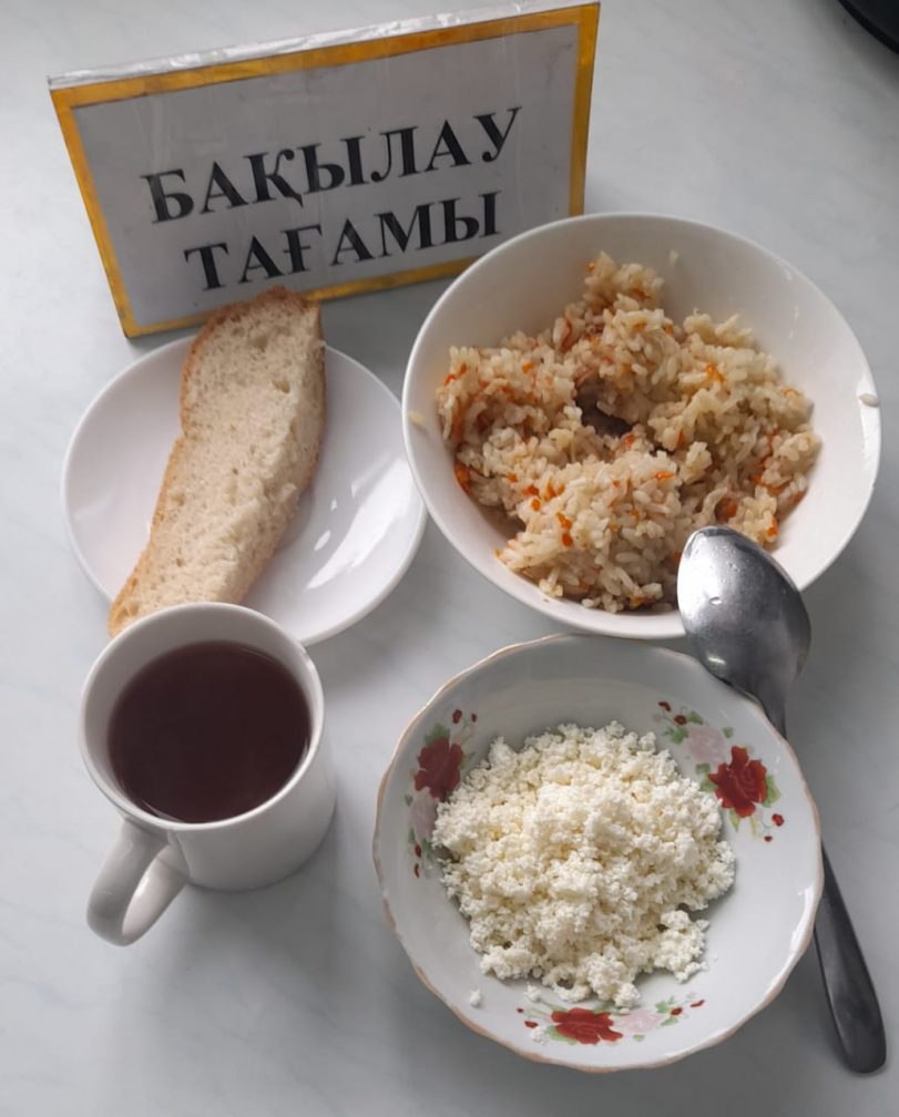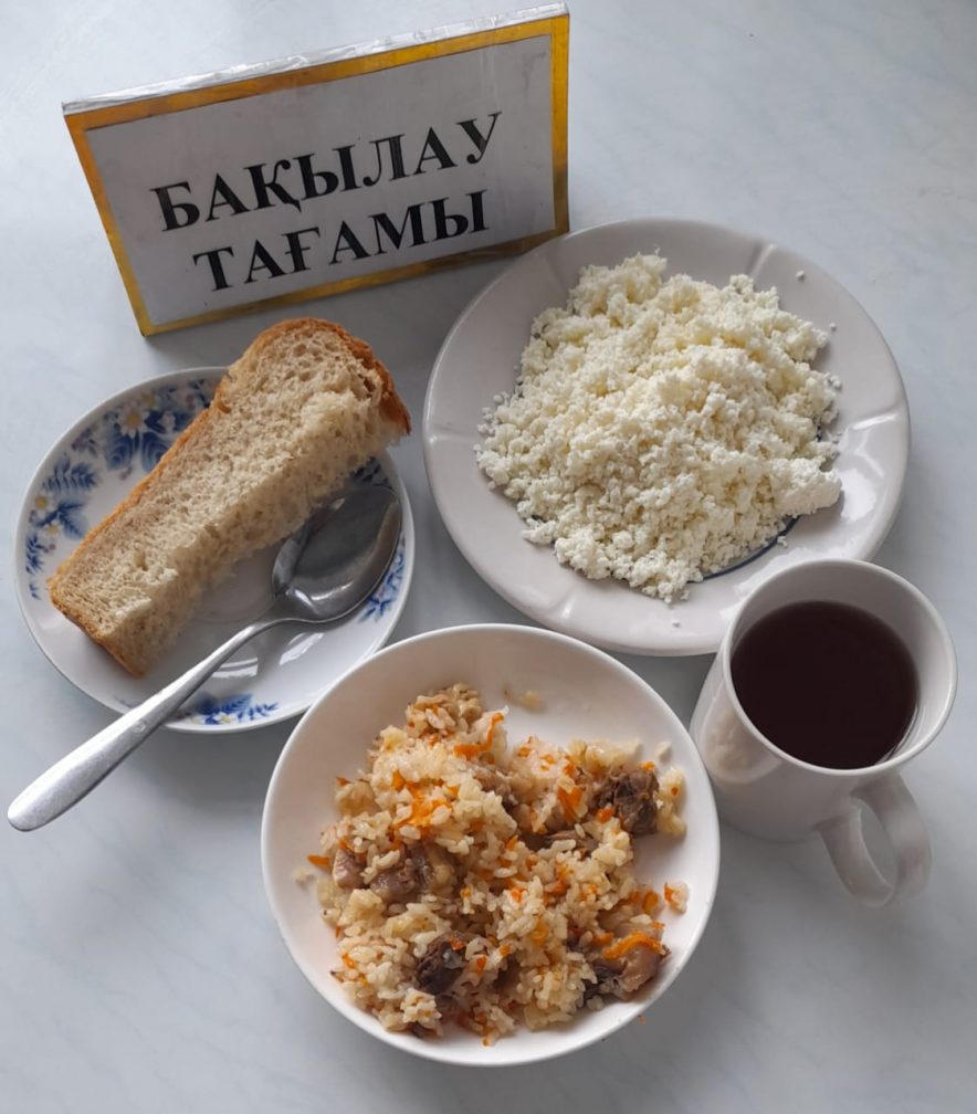 01.10.2025жыл. Ас мәзірі: Плов, нан, сүзбе, қант қосылған тәтті шай.