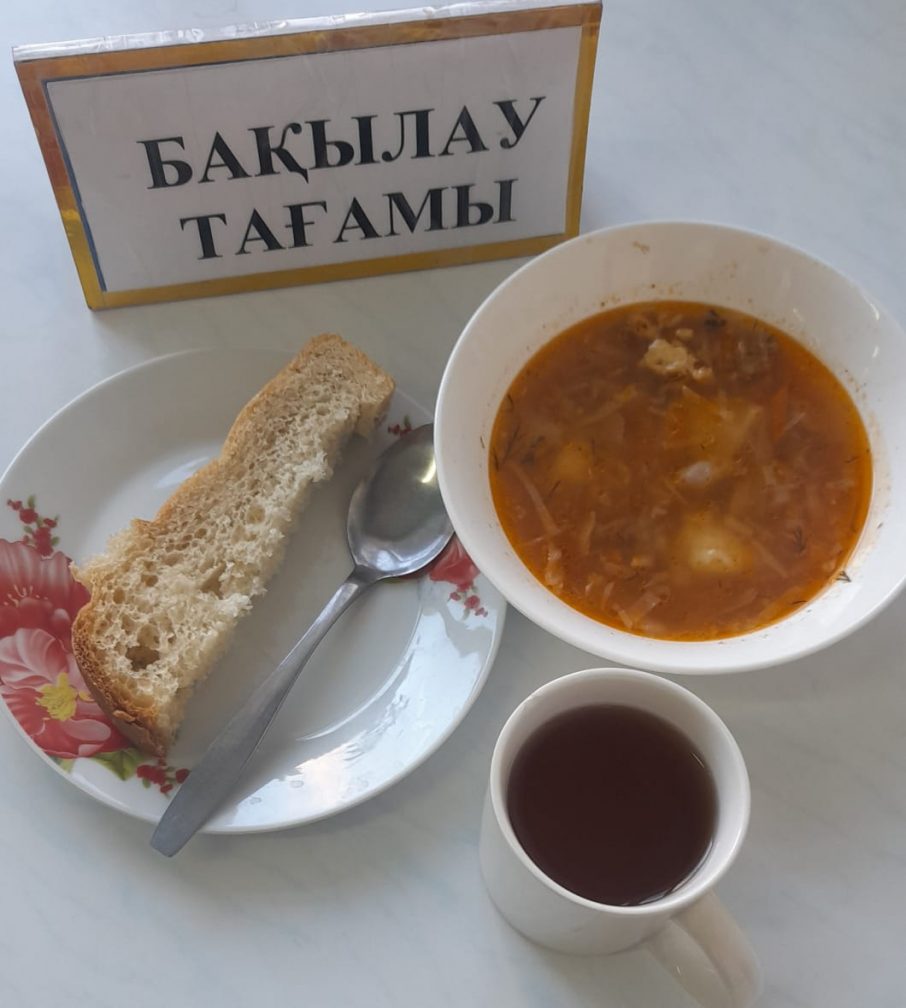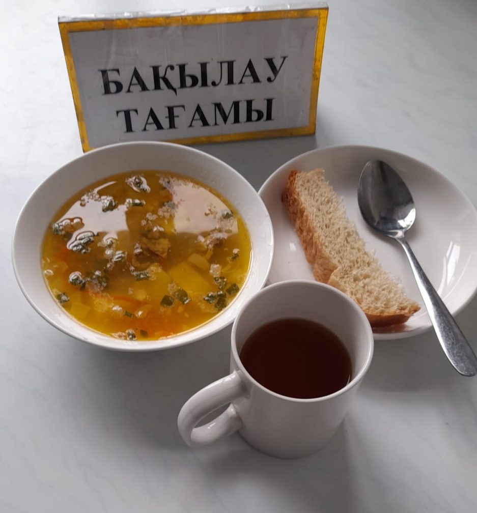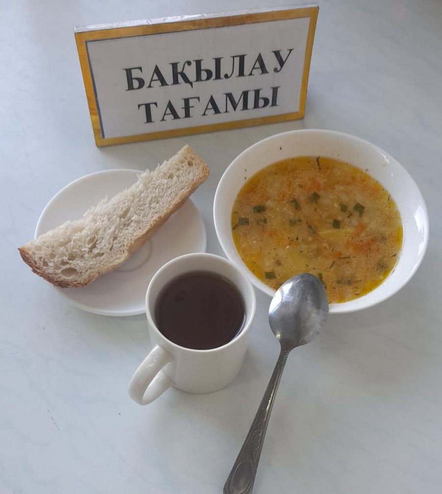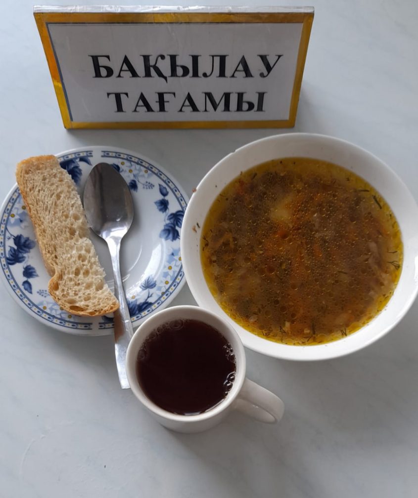 06 ақпан 2025 жыл Ас мәзірі:1.Сиыр еті қосылған тары сорпасы 2.Нан 3.Лимон мен қант қосылған шай 4.Бұқтырылған балық 5.Бал 6.Сәбіз қосылған қырыққабат салаты.