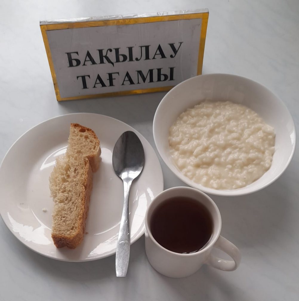 14.04 2025 жыл Ас мәзірі: 1.Сүтті күріш ботқасы 2.Нан 3.Қант қосылған шай 4.Сары май 4.Ірімшік