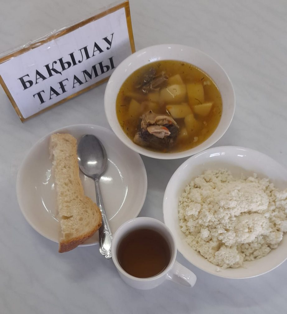 21 ақпан 2025 жыл Ас мәзірі: 1.Қарақұмық қосылған сиыр гуляшы 2.Нан 3.Табиғи шырын 4.Сүзбе
