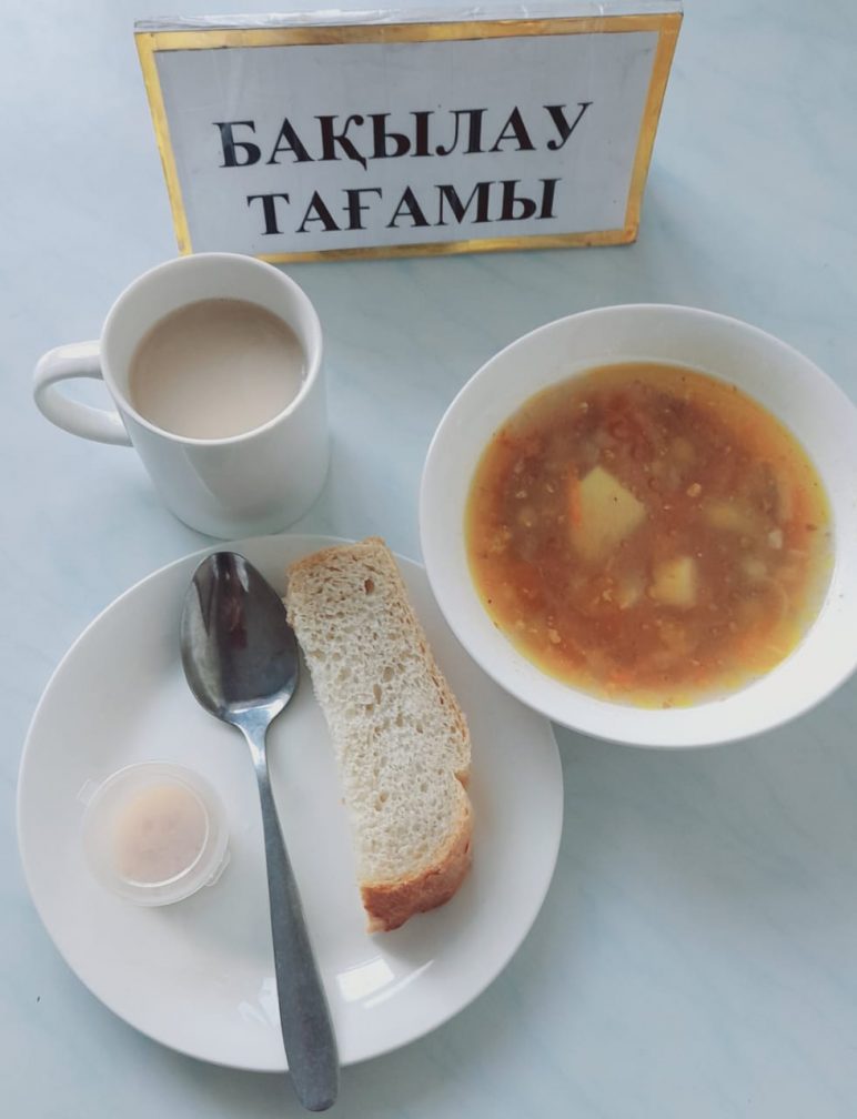20 ақпан 2025 жыл Ас мәзірі: 1.Ет сорпасында қарақұмық сорпасы 2.Нан 3.Лимон мен қант қосылған шай 4.Бұқтырылған минтай балығы 5.Бал 6.Сәбіз қосылған қырыққабат салаты