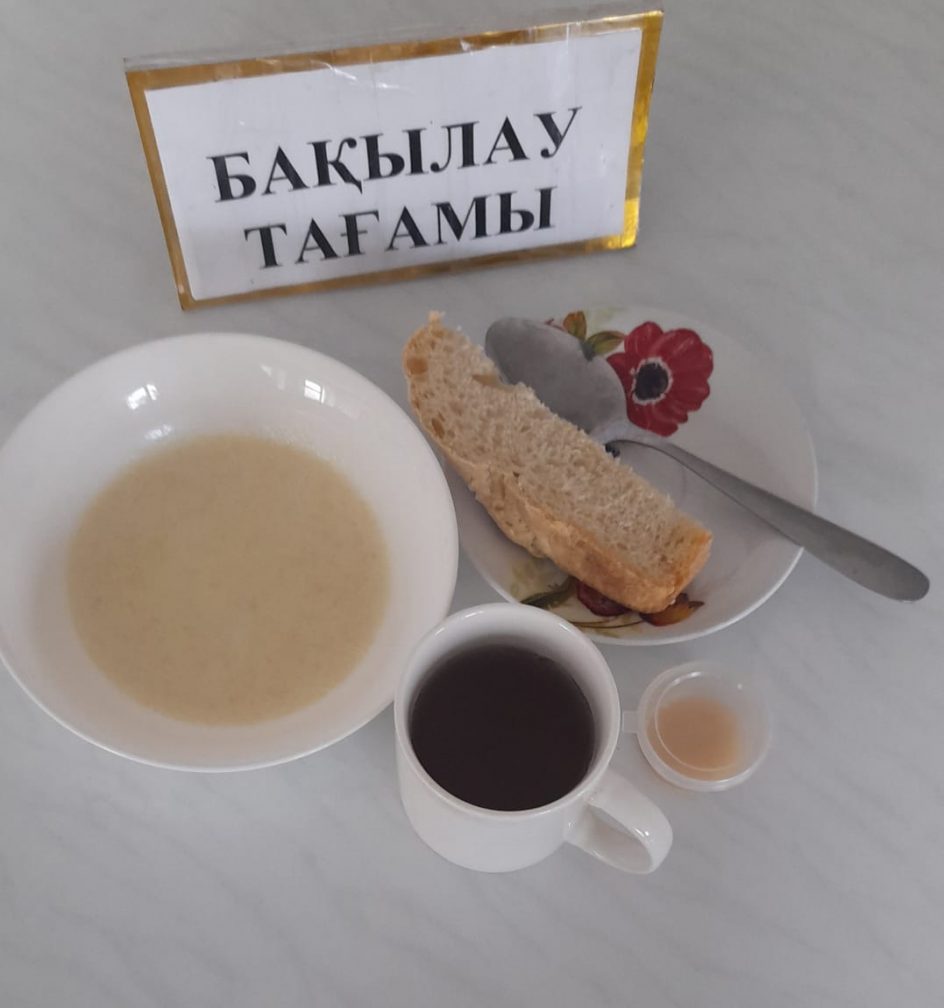 24 ақпан 2025 жыл Ас мәзірі: 1.Тары сүт ботқасы 2.Нан 3.Лимон мен қант қосылған шай 4.Сары май, ірімшік 5.Бал