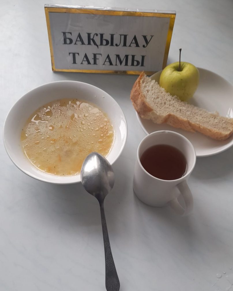 22 қараша 2024 жыл Ас мәзірі:1.Сиыр еті қосылған тары сорпасы 2.Қант қосылған шай 3.Нан 4.Бал 5.Алма